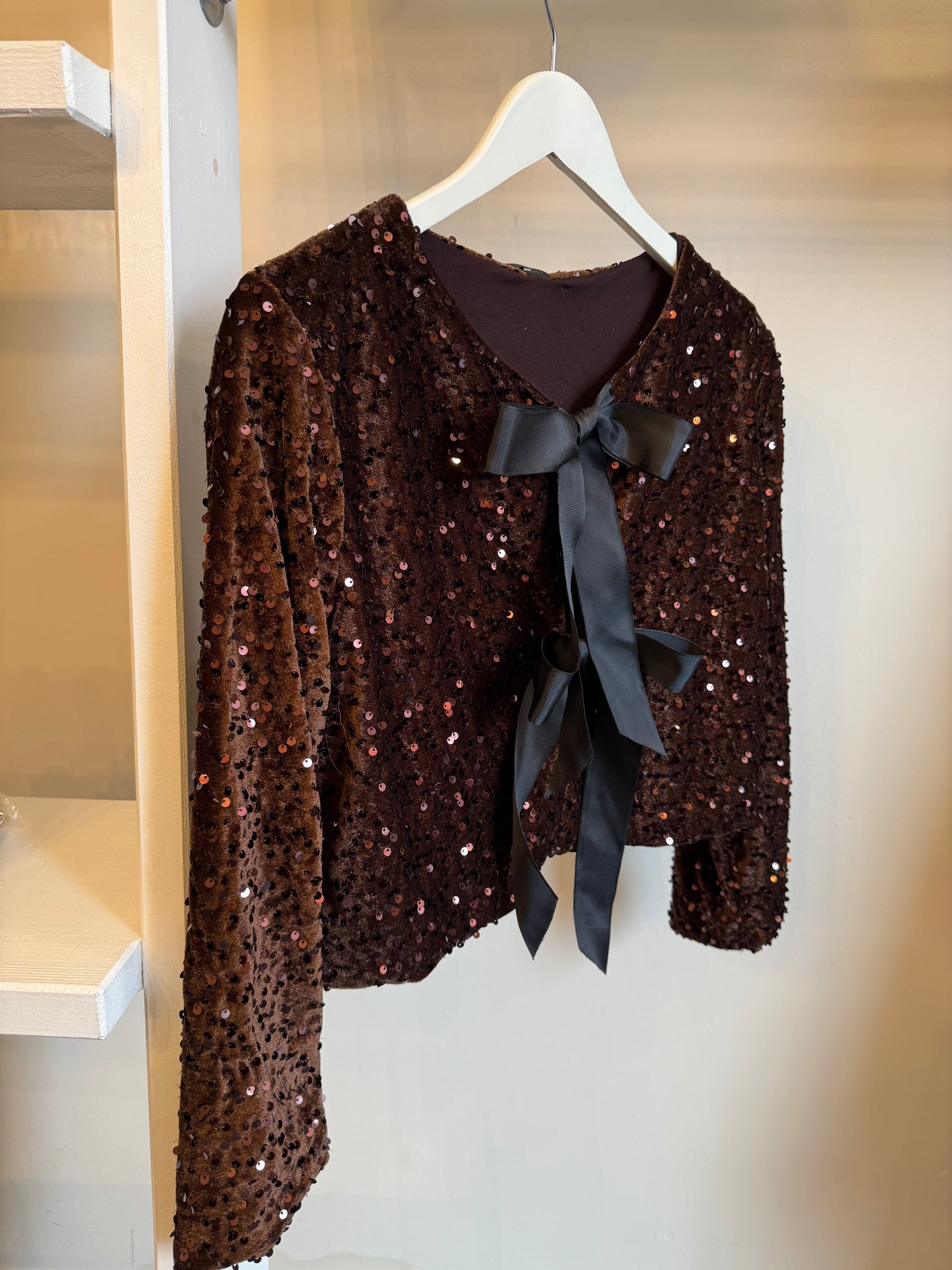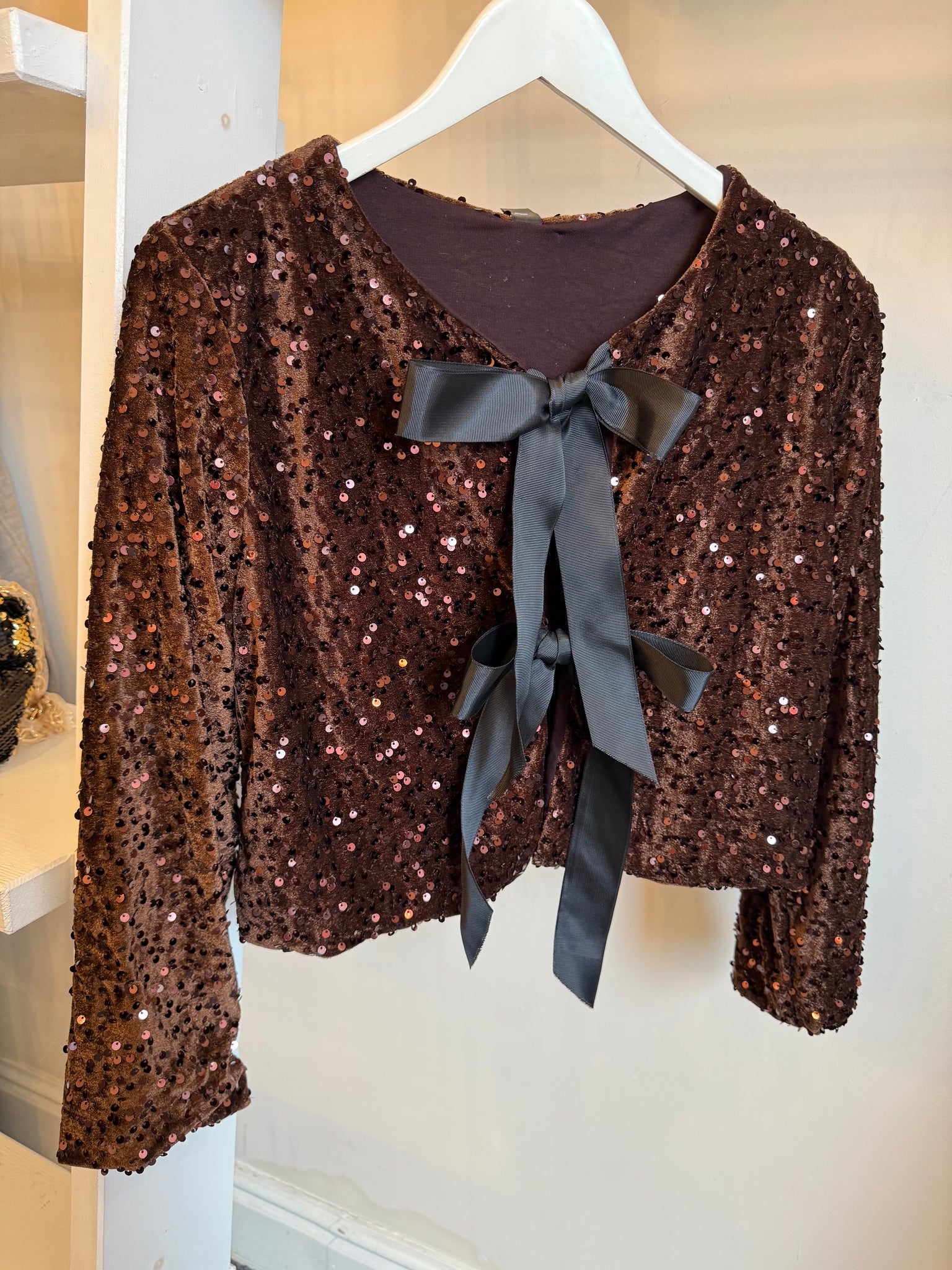 Brown sequin top with black bow ties