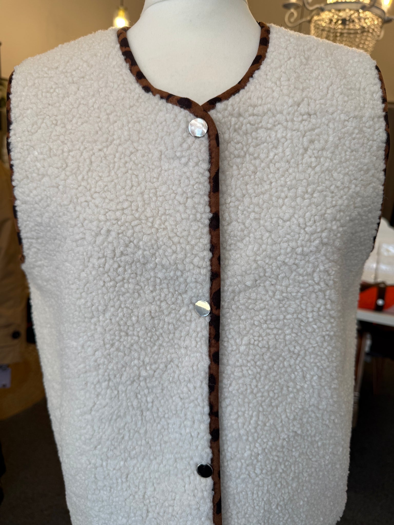 Cream Teddy body warmer with leopard piping and lining