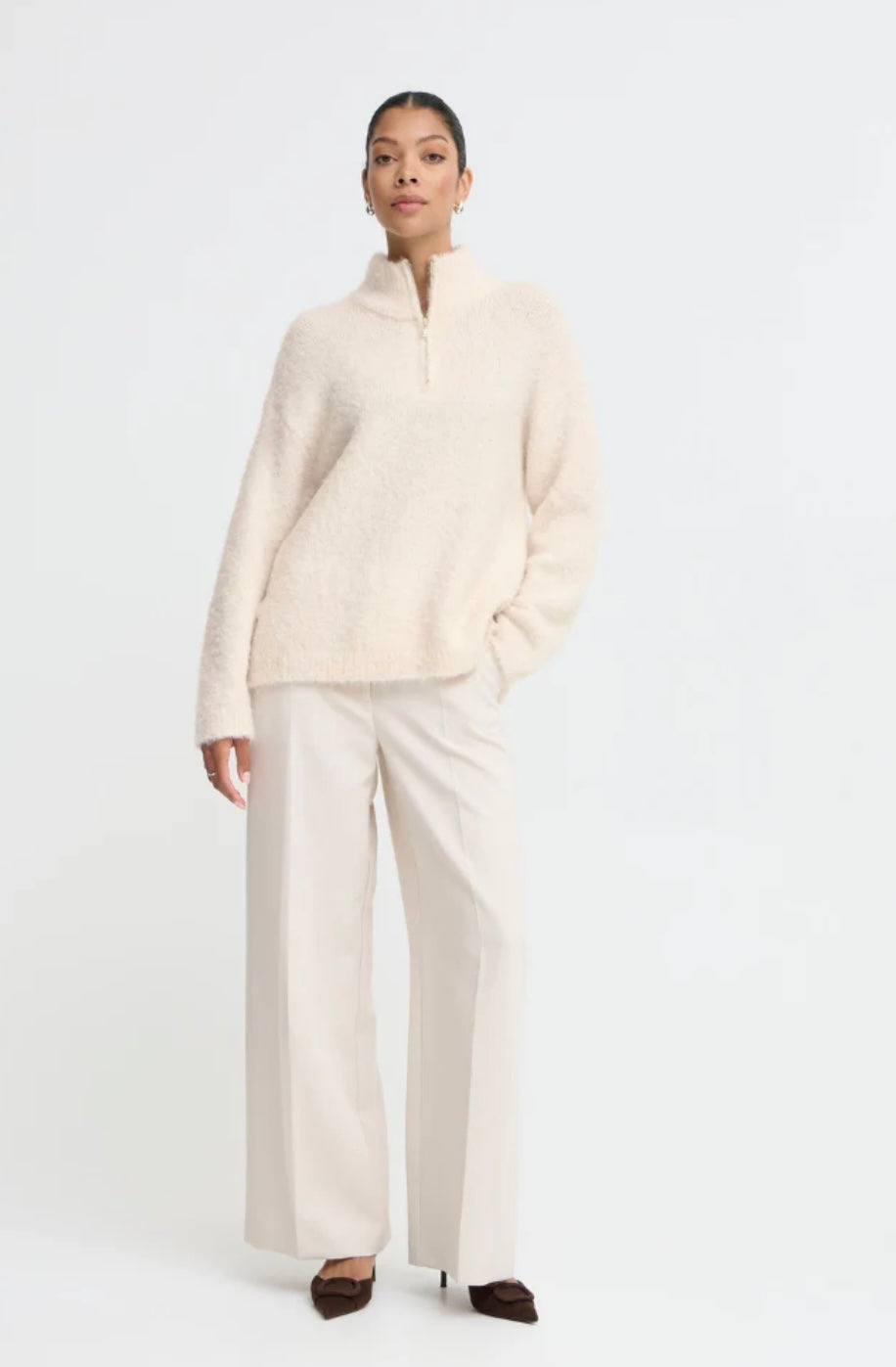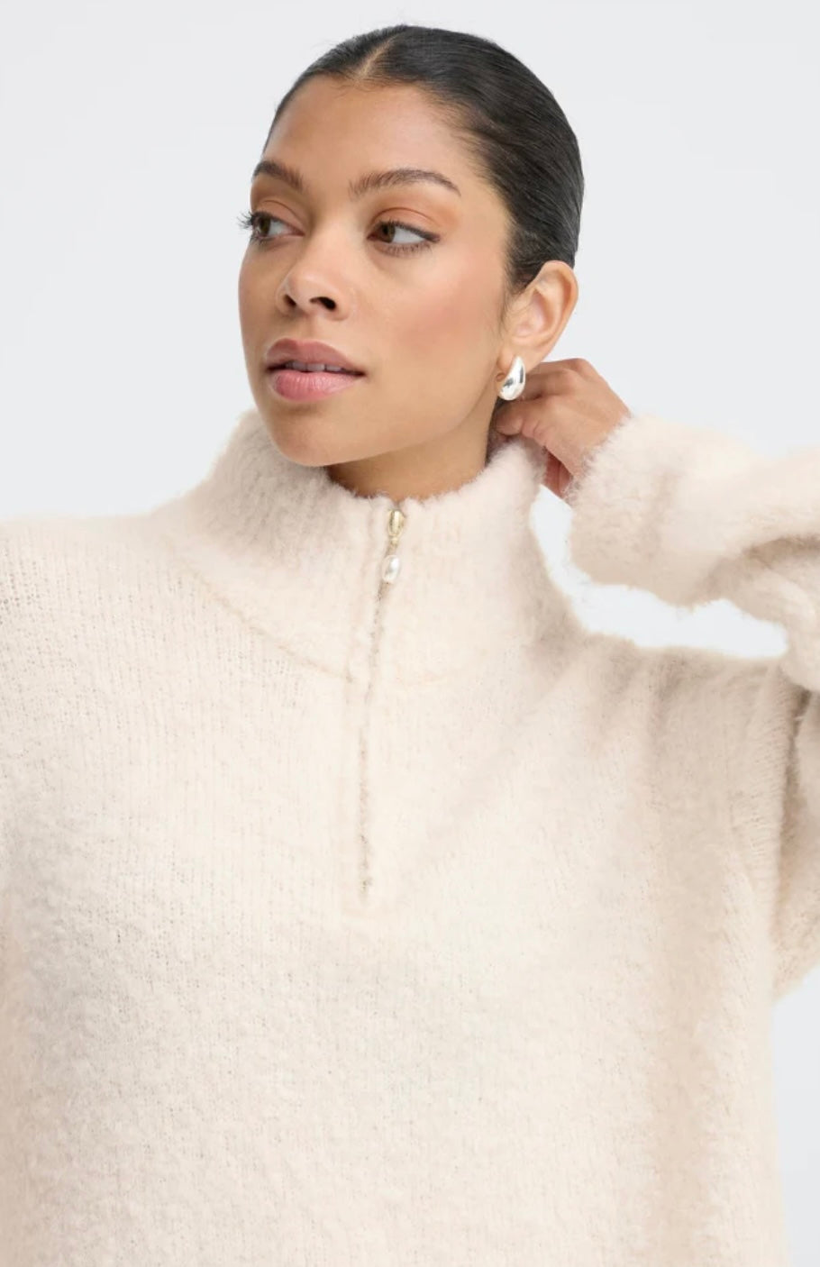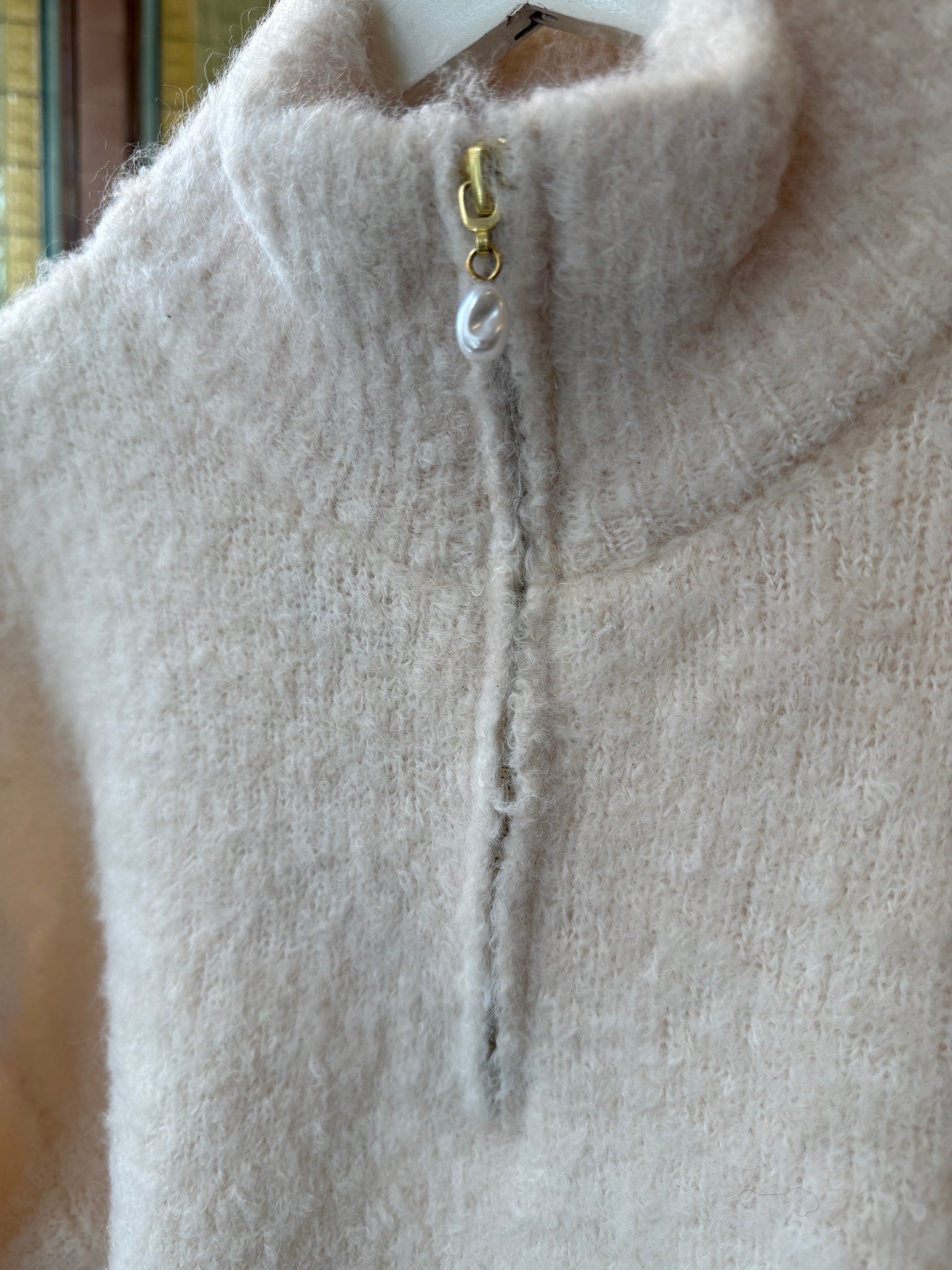 Cream half zip jumper by B Young. Long sleeves, loose fit with pearl detail to zip.