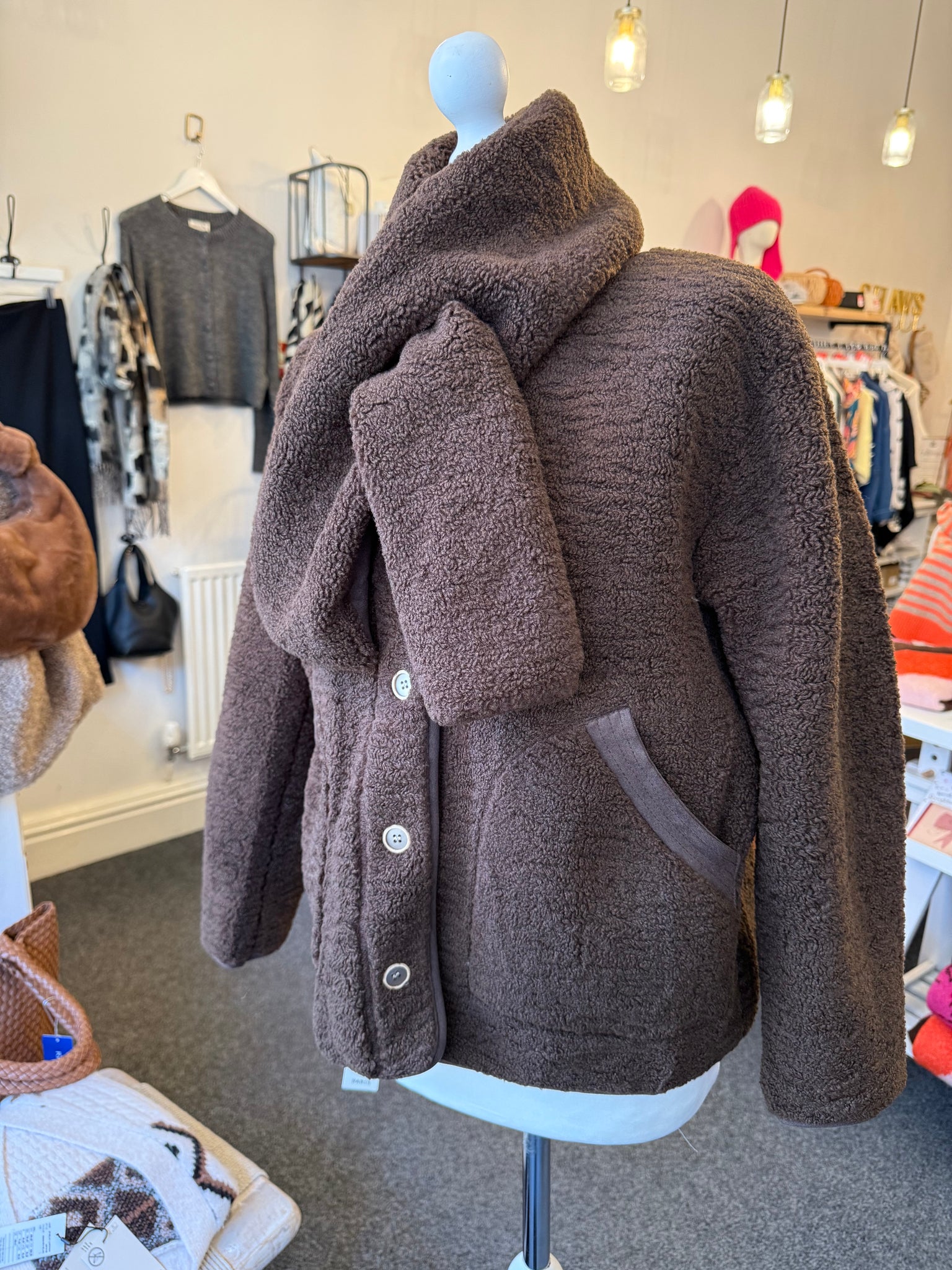 Teddy brown jacket with detachable matching scarf.